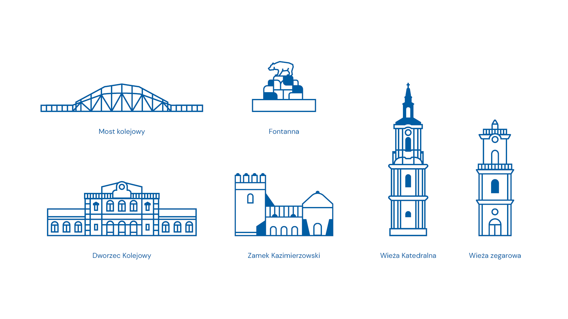 Five linear landmarks were designed for the project, representing iconic locations of Przemyśl: the Clock Tower, Cathedral Tower, Bear Monument, Railway Station and Railway Bridge.